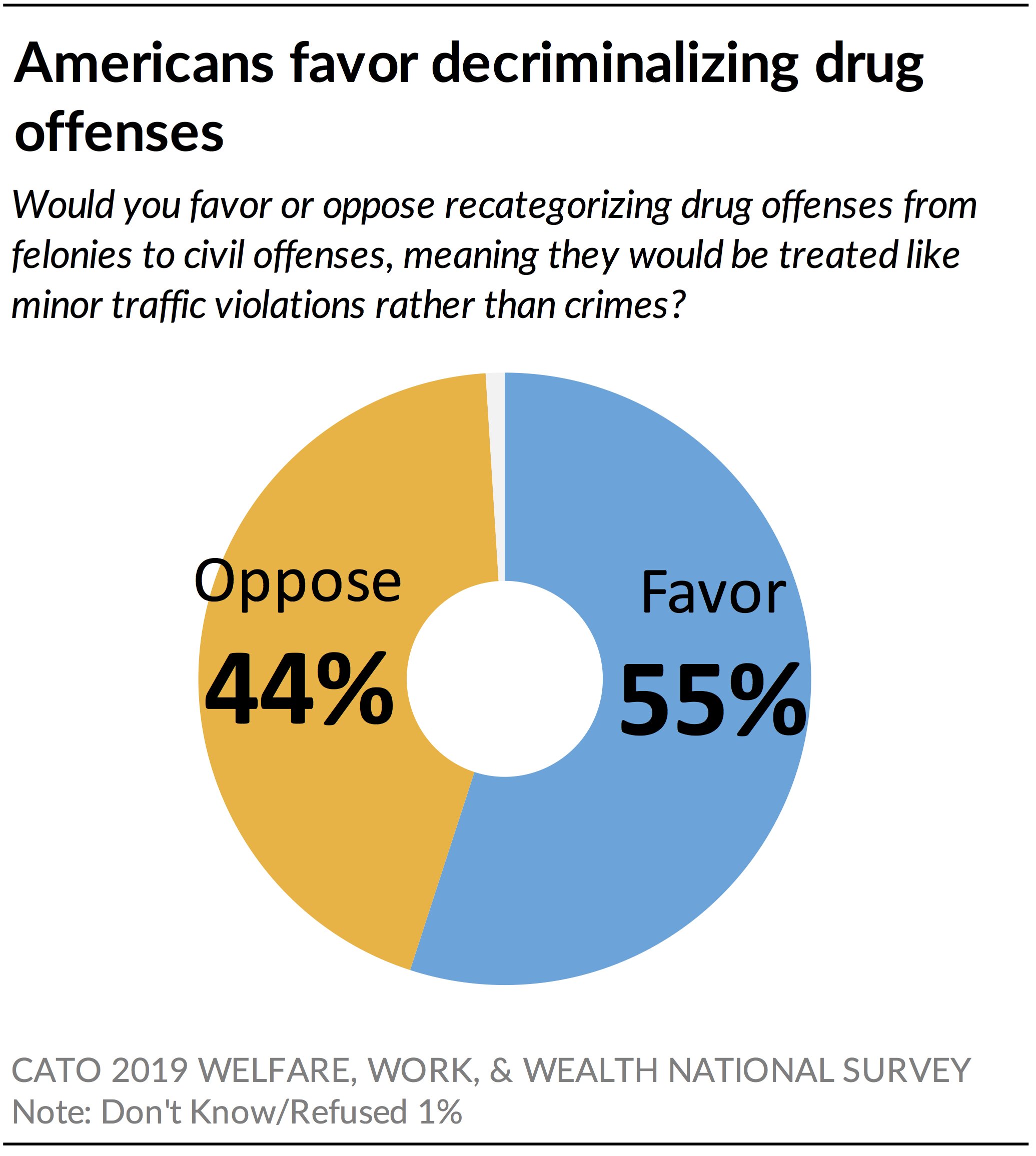 The Cato 2019 Welfare, Work, and Wealth National Survey finds that a majority, 55%, of Americans favor “recategorizing drug offenses from felonies to civil offenses” such that they “would be treated like minor traffic violations rather than crimes.” Forty-four percent (44%) oppose treating drug offenses like traffic tickets.