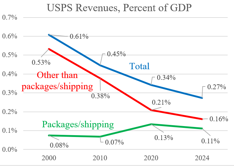 The figure below shows that USPS revenues are a shrinking part of gross domestic product (GDP). While revenues from packages and shipping have risen, revenues from letters, marketing mail, and periodicals have plunged. Excluding packages and shipping, USPS revenues have fallen to less than one-third the level of 2000, relative to GDP.