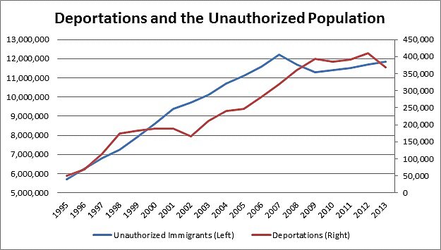 Shifting subjects a bit, these deportation numbers point to just how effective immigration enforcement is. There are only 11.7 million unauthorized immigrants in the United States – an admittedly large number – but much smaller than I would expect given the tremendous economic gains from coming here. Measured in that way, most would-be unauthorized immigrants actually follow our laws.