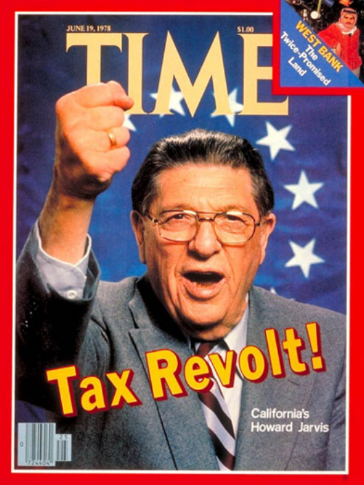 Howard Jarvis led the drive for Proposition 13 and made the cover of Time magazine, as shown. California property taxes are generally capped at one percent of purchase price plus an annual inflation factor. The large margin for Proposition 13 passage was impressive given that only some voters are property owners while many are renters.