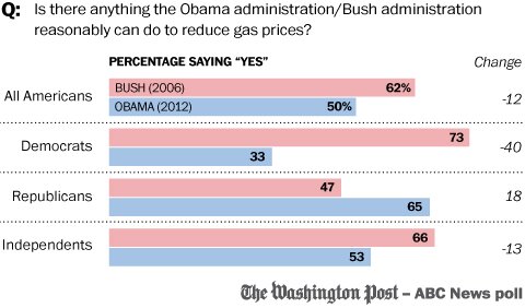 Pretty clear Red Team/Blue Team answers. Republicans in 2006 accepted that there wasn’t much the president could do to reduce gas prices, but most of them think Obama could. Democrats show an even sharper shift; they overwhelmingly said that Bush could bring prices down, but few expect Obama to do so. I hope the fact that both Independents and Americans as a whole are 12–13 points less likely to think that presidents set gas prices is a sign of improvement in general economic understanding.