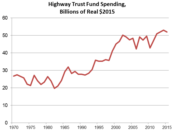 Cutting HTF spending by $13 billion would be a substantial reform, but a reasonable one given the rise in HTF spending over the years. The chart below shows HTF spending since 1970 in real, or inflation-adjusted, dollars. The Interstate Highway System was essentially complete by the early 1990s, so you might think that federal spending would have fallen after that. Instead, spending ballooned between the mid-1990s and mid-2000s, and it has remained at an elevated level ever since. (HTF data here and here. I used the CPI to convert to 2015 dollars).