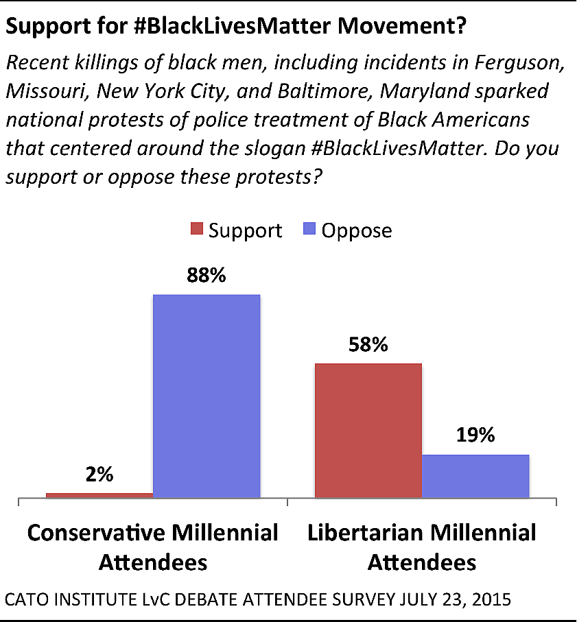 In contrast, 58% of libertarian millennials support the #BlackLivesMatter protests; the remainder said they didn’t know enough to say (25%) or they opposed (19%).