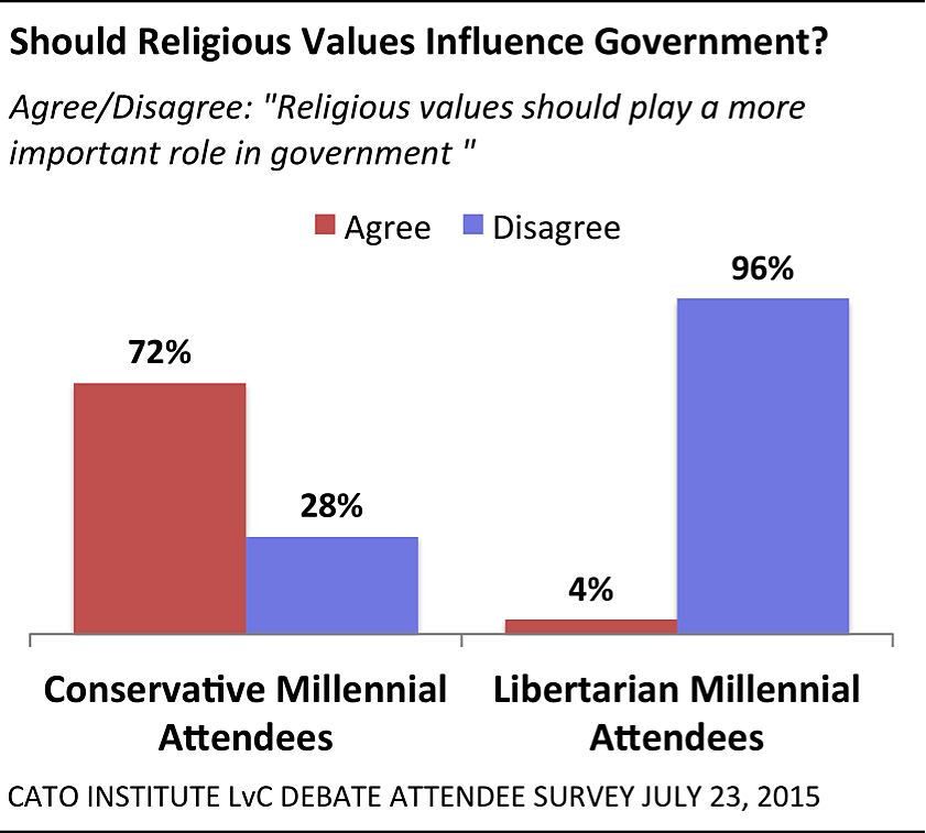 Part of these differences might be explained by the fact that 72% of conservative attendees agreed that “religious values should play a more important role in government” while 96% of libertarian attendees disagreed.