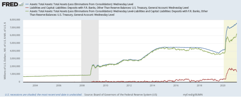 Like banks and unlike most of us (so far), the United States Treasury has an account at the Fed, called the “Treasury General Account” (TGA), where it deposits proceeds from taxes and bond sales, and upon which it draws to make government payments, including relief payments. Ordinarily, funds coming into the account roughly suffice to cover disbursements. But during emergencies, like wars, the government may have to pay out funds faster than it can raise them.