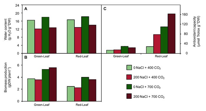 Figure 1. Effects of salt treatment and CO2 concentration on water content (A), biomass production (B) and antioxidant capacity (C) of green leaf and red leaf lettuce. Adapted from Pérez-López et al. (2015).