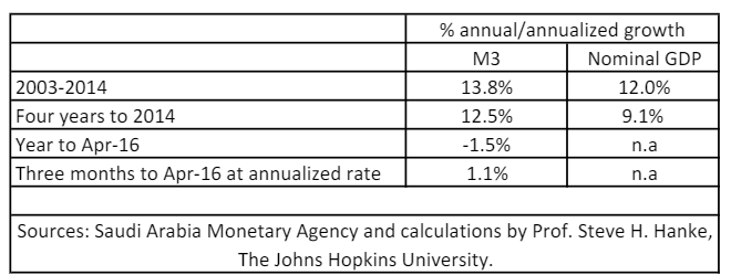 The rate of growth in a country’s money supply, broadly measured, will determine the rate of growth in its nominal GDP. For Saudi Arabia, the following table presents a snapshot of the relationship between the growth in the money supply (M3) and nominal GDP.