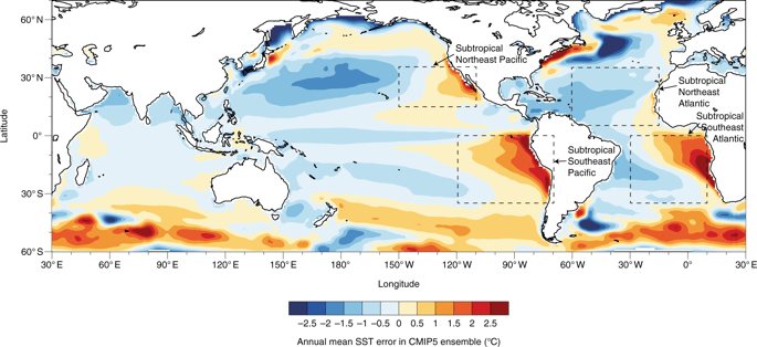 Annual sea-surface temperature error (modelled minus observed) averaged over the current family of climate models. From Eyring et al.