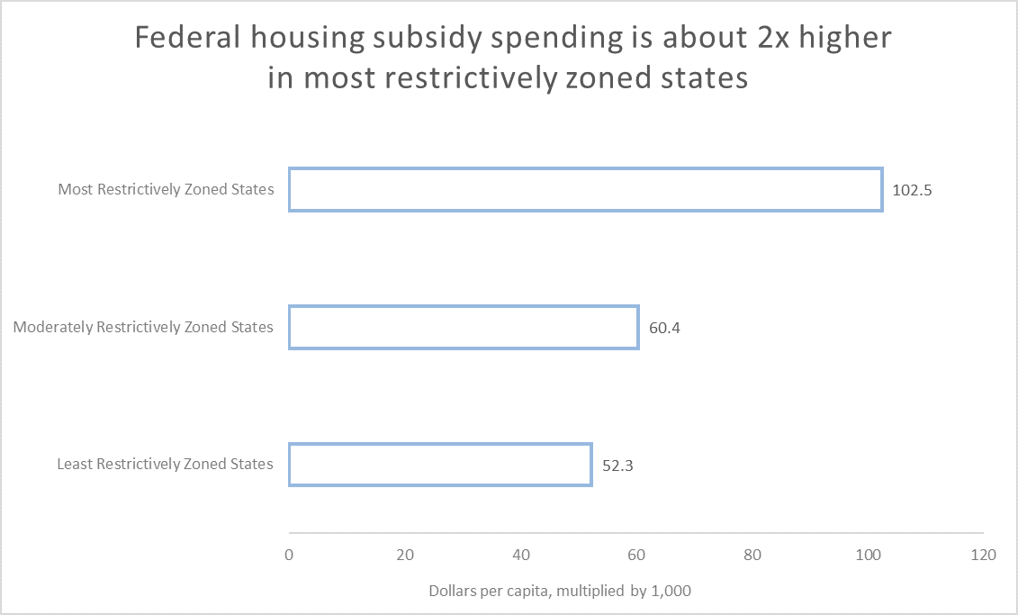 Carson seems to understand that federal assistance has encouraged poor local policies. In a Cato report published last year I show that the federal government subsidizes housing in states with more restrictive zoning at higher rates than those with less restrictive zoning. Specifically, the most-restrictively zoned states receive nearly twice the federal dollars per capita compared to the least-restrictively zoned states (see figure).