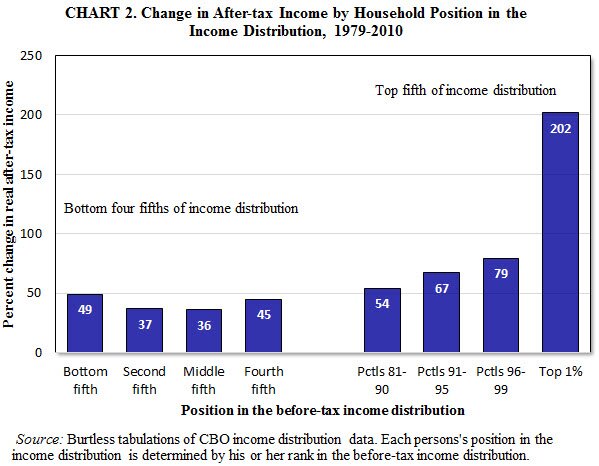 Economist Gary Burtless of the Brookings Institute showed that between 1979 and 2010, the real (inflation-adjusted) after-tax income of the top 1% of U.S. income-earners grew by an impressive 202%. He also showed that the real after-tax income of the bottom fifth of income-earners grew by 49%. All groups made real income gains. While the rich are making gains at a faster pace, both the rich and the poor are in fact becoming richer.