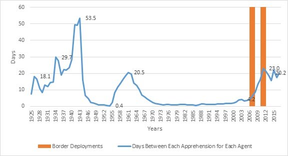 The two recent deployments to assist in enforcing immigration law along the border occurred when there were fewer apprehensions, represented by more days between each apprehension for each agent (Figure 1). The higher the number for the blue line in Figure 1, the fewer people Border Patrol agents individually apprehend. From about 1970 through 2006, the Border Patrol faced an annual inflow of illegal immigrants far in excess of anything in recent years yet President Trump has decided that this is the time to put troops on the border.