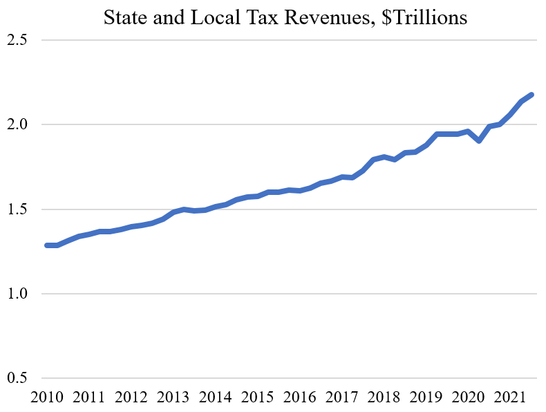 Estimated revenues in the third quarter of 2021 were $2.18 trillion, up 11 percent from the pre-pandemic level of $1.96 trillion in the first quarter of 2020. Put another way, annual state and local tax revenues are currently about $220 billion higher than before the pandemic.