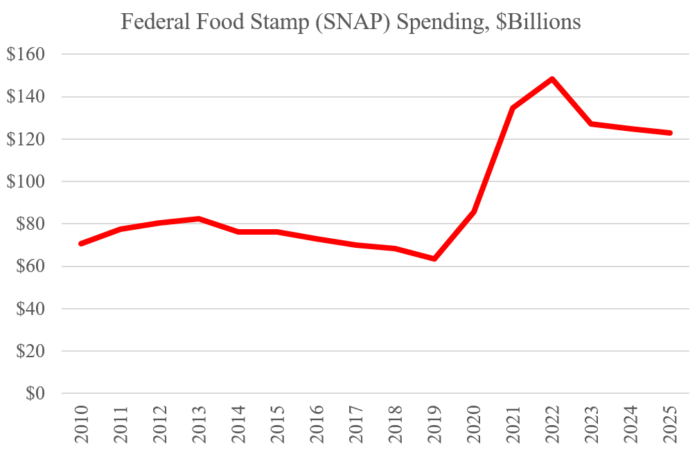 The ratcheting-up of spending is evident with the Supplemental Nutrition Assistance Program (SNAP). SNAP benefits, or food stamps, are administered by the states but funded by the U.S. Department of Agriculture (USDA) and ultimately federal taxpayers.