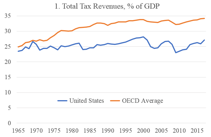 Figure 1, below, shows that total tax revenues were similar in the United States and the OECD in the 1960s. In subsequent decades, OECD countries grew their governments, and by 2017 average OECD tax revenues were 34.2 percent of GDP compared to 27.1 percent in the United States.