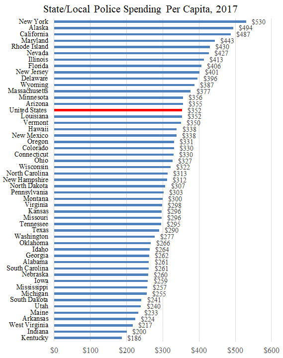 Police spending varies substantially by state, as shown in the chart below based on the Census data. The U.S. average is $352 per capita. I don’t know what the proper level of spending is, and obviously the states vary in terms of crime rates, cost of living, and other factors.