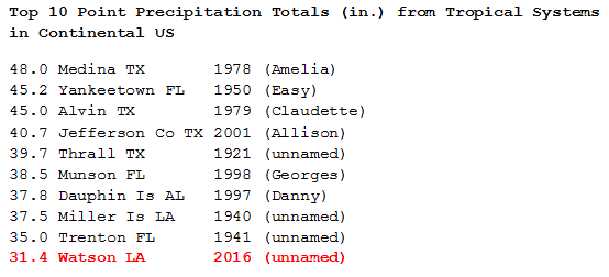 We were equally quick to point out that there was no need to invoke global warming in that the central Gulf Coast is prime country for big rain events and that similar, and even larger, rainfall totals have been racked up there during times when there were far fewer greenhouse gases in the atmosphere—like in 1979 when 45 inches of precipitation fell over Alvin, TX from the slow passage of tropical storm Claudette, or in 1940 when 37.5 in. fell on Miller Island, LA from another stalled unnamed tropical system.