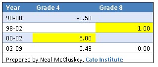 We can begin to answer that by looking at National Assessment of Educational Progress outcomes for those groups that have typically struggled the most — generally, low-income kids — and seeing if their scores erupted under NCLB. What follows are several charts for both the NAEP Long-Term Trend (LTT) and Main tests, showing score changes per-year (out of 500 points) in periods between test administrations. Those periods that are highlighted saw greater increases than in the periods completely included in NCLB. Note that a few periods include some years under NCLB and some not. Because it took significant time to fully implement NCLB after it was passed in January 2002, periods that overlapped with the beginning of NCLB are counted as not reflecting NCLB. That is, of course, debatable, so take those with a grain of salt. Also, the best proxies available for income-level are used, which sometimes is parents’ education level, sometimes qualifying for subsidized lunch, and once race.