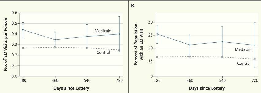 A similar analysis for hospital admissions comes to the same result: “no evidence statistically or substantively of a time trend in the impact of Medicaid on having a hospital admission or on the number of days in the hospital.”