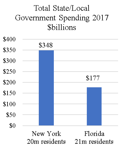 The chart shows Census Bureau data for 2017. New York and Florida have similar populations, yet state and local governments in New York spent twice as much as governments in Florida, $348 billion vs. $177 billion.