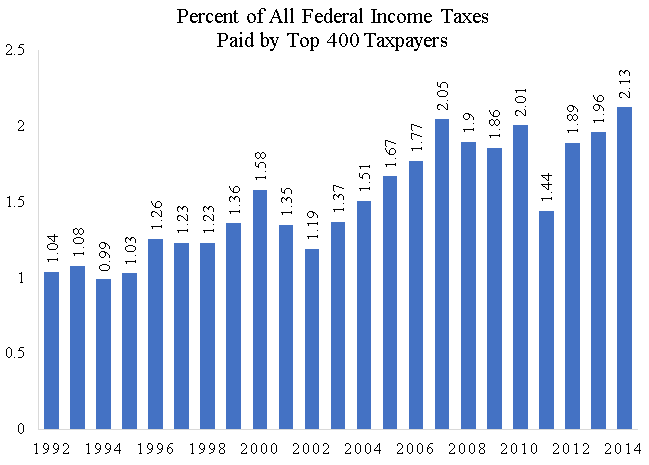 The Top 400 paid 2.13 percent of all federal income taxes in 2014. That share has trended upwards over time, as shown in the chart. Indeed, the Top 400 share of taxes has doubled from 1.04 percent in 1992, which is the first year of IRS data.