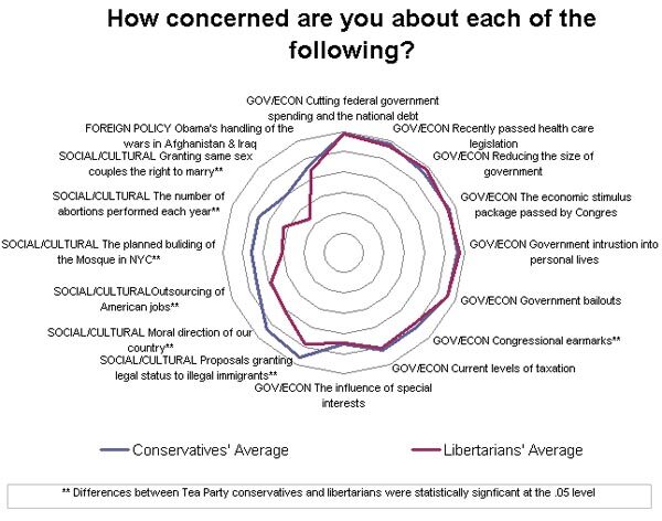 Both groups are extremely concerned about the recently passed health care reform, cutting federal government spending, and reducing the size of government. However, Tea Party libertarians are less concerned than conservatives about the moral direction of the country, gay marriage, immigration, job outsourcing, “the Mosque in NYC,” and abortion. While these differences may seem subtle, given the question wording we used, small changes are statistically significant.