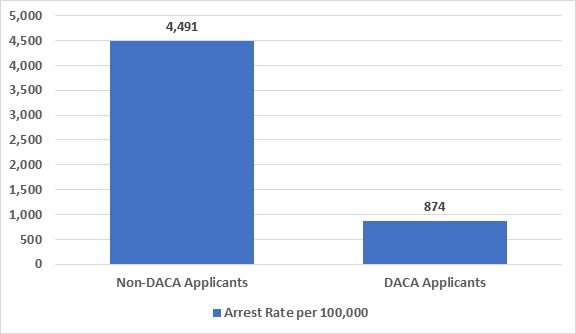 The USCIS report does not provide arrest rates for DACA applicants or other populations in the United States. As a result, there is no standard of comparison for the number of arrests mentioned in the USCIS report. However, some data released in the report do allow for a back of the envelope comparison between the arrest rate for DACA applicants and the arrest rate for the population of all others.