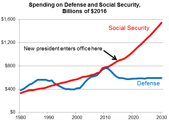 When the next president enters office in 2017, he will start planning his 2018 budget. In that year, Social Security will become the first trillion-dollar program, and it will be gobbling up an additional $60 billion or so every single year. Where will all the money come from? Pointing only to “waste, fraud, and abuse,” as Trump does, wastes our time, abuses our intelligence, and is a fraudulent story line to peddle.