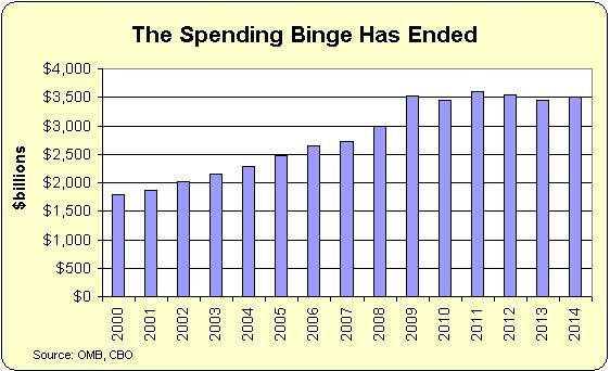 Here are some specific numbers culled from the OMB data and CBO data. In fiscal year 2009, the federal government spent about $3.52 trillion. In fiscal year 2014 (which ended on September 30), the federal government spent about $3.50 trillion.