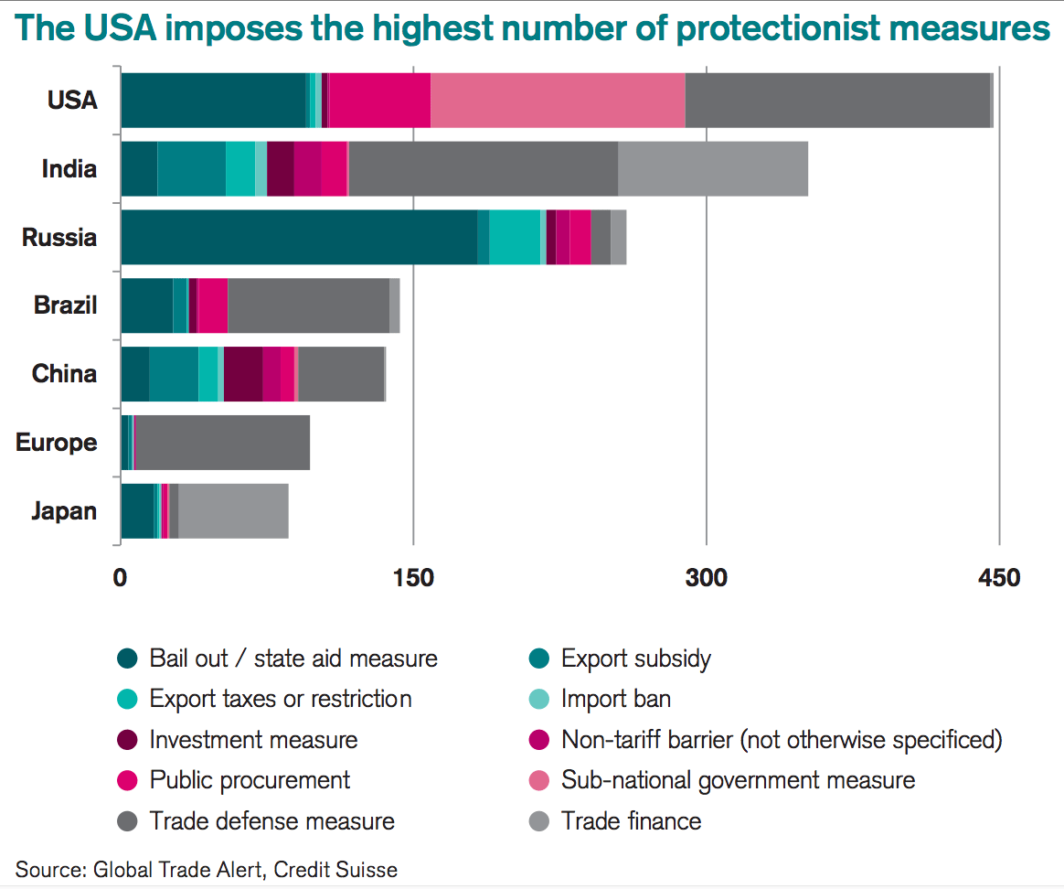 Second, while America’s tariffs and other “formal” trade barriers have indeed been declining for decades, they are only a small part of the overall story. U.S. non-tariff barriers – export subsidies, discriminatory regulations, “buy local” rules, “fair trade” duties, etc. – have exploded in recent years. In fact, according to a recent analysis by Credit Suisse, when you add up all forms of trade barriers imposed between 1990 and 2013, the biggest protectionist in the world isn’t China or Mexico but none other than… the United States: