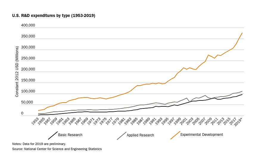 That same dataset shows that all forms of R&D — basic, applied, and experimental development — also hit all-time highs in 2019: