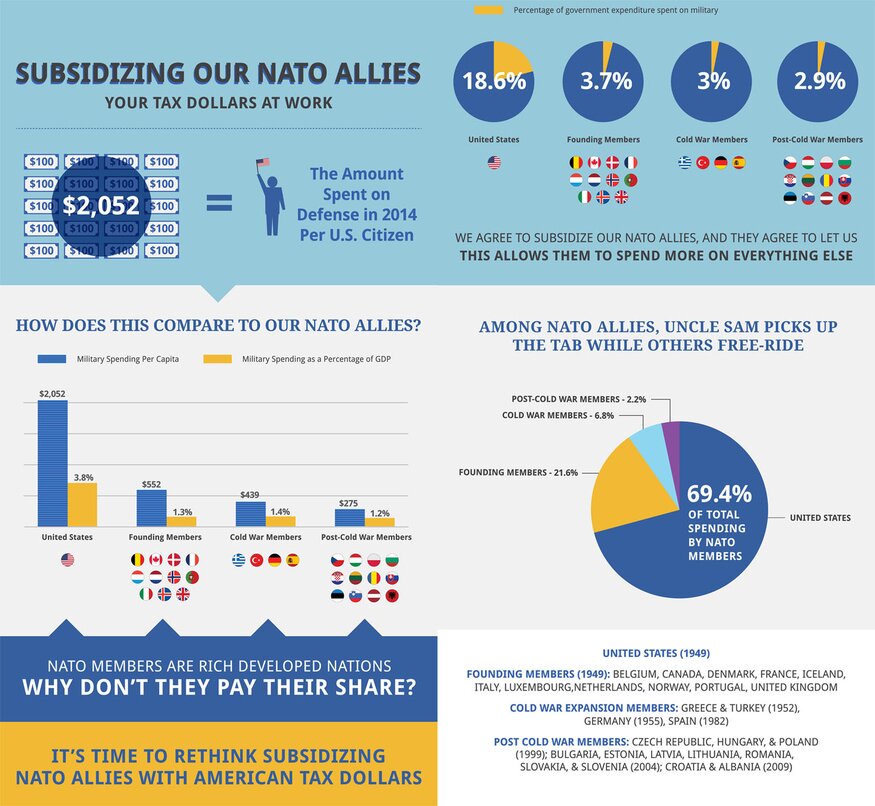 According to the most recent NATO figures*, the United States spent an estimated $654 billion or 3.8 percent of its GDP, on defense (based on the NATO definition) in 2014. That amounts to $2,052 spent by every man, woman, and child in America, nearly 4 times more than the average in NATO founding states, and 7 times more than was spent in those member states that have joined NATO since the end of the Cold War. As a share of the sum total of NATO member states’ defense spending, U.S. taxpayers contributed nearly 69 percent, even though the United States accounts for only 46 percent of total economic output by NATO members. And the free-riding problem has only been getting worse. Total military spending by NATO’s European members was less in real terms in 2014 than in 1997 – and there are 12 more member states in NATO today.