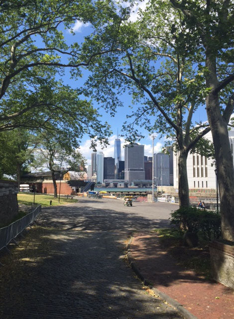 I was skeptical. There were few others there as I strolled the peaceful grounds on a pleasant weekday. The National Park Service supervises the 22 acres of the Governors Island National Monument, and park rangers and volunteers showed people around and answered questions. A few folks tooled around on two-person bikes, and the lucky ones had golf carts for shuttling between the historic properties, including Fort Jay and Castle Williams (a former prison). For the most part, the walkways were sparsely populated or empty. The view of Lower Manhattan through the talls trees was striking.