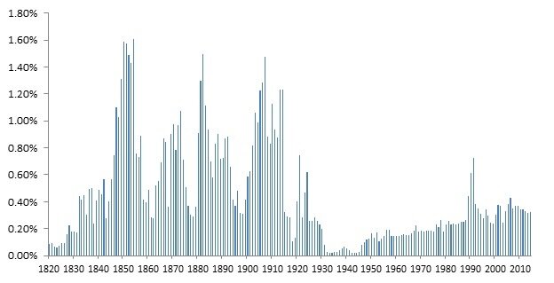 Another way to view the rate of immigration is to look at the net increase in the total foreign-born population—which includes unauthorized immigrants—as a share of the overall population. The Census Bureau’s records on the foreign-born population only go back to 1850, but the annual rate of increase in recent years is also well within historical norms. The aberration was the 1930s to 1960s when the foreign-born population shrank in size. The United States is returning to its historical average of 0.21 percent. The rate in 2014 was 0.22 percent.