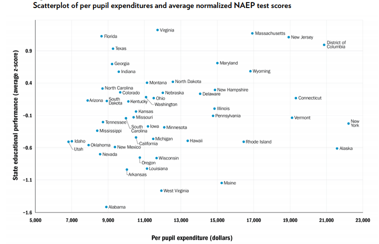 The chart shows the authors’ quality score on the vertical axis and per-pupil spending in nominal dollars on the horizontal axis. Consider that students in many states score higher than students in New York yet those states only spend half of what New York does. Compare Florida, Texas, and Virginia to New York, for example.