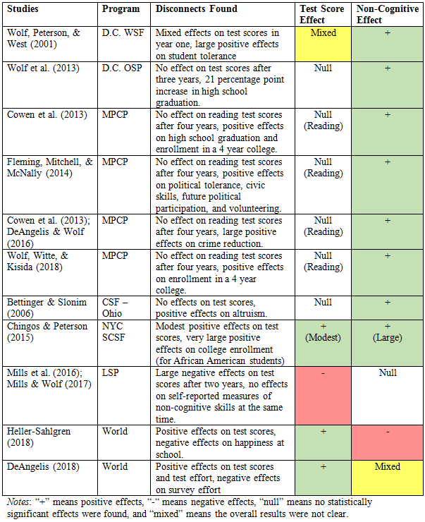 Similarly, I have started to review the causal private school choice literature that indicates divergences between effects on test scores and other long-run outcomes such as student criminality, effort, and happiness. As shown in the table below, I’ve found 11 disconnects in the literature since 2001. For example, the sample of students from the state-mandated evaluation of the Milwaukee voucher program saw no statistically significant improvements in reading test scores after the fourth year. However, those same students were more likely to enroll in a four-year college and less likely to engage in criminal activity later on in life. In other words, putting too much weight on standardized tests – like NAEP – could compromise the character development necessary for real lifelong success.
