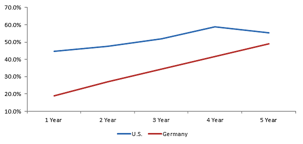 Figure: Employment Rates in United States and Germany for Refugees (Ages 16+) By Years Since Arrival
