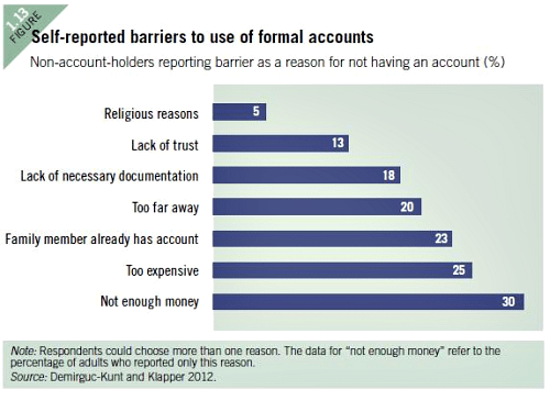 The data show that 50 percent of adults worldwide have an account at a formal financial institution… Although half of adults around the world remain unbanked, at least 35 percent of them report barriers to account use that might be addressed by public policy.