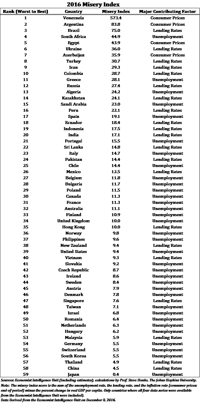 Venezuela holds the inglorious spot of most miserable country for 2016, as it did in 2015. The failures of the socialist, corrupt petroleum state have been well documented over the past year, including when Venezuela became the 57th instance of hyperinflation in the world.