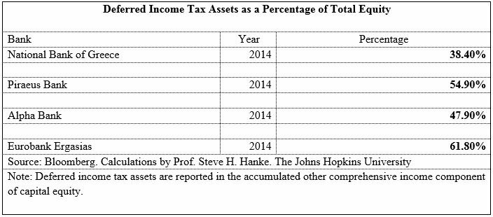 Despite the already worry-some numbers, the actual situation is far worse than even I had initially deduced. A deeper analysis of the numbers reveals that Greece’s largest banks include deferred tax assets as part of total equity in their financial statements. Deferred tax assets are created when banks are allowed to declare their losses at a later time, thereby reducing tax liabilities. This is problematic because these deferred tax assets are really just “phantom assets” in the sense that these credits cannot be used (read: worthless) if the Greek banks continue to operate at a pretax loss.