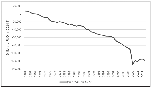 Figure 31.1 presents estimates of U.S. fiscal imbalance for the period 1965–2014. Imbalance has risen enormously from roughly zero in 1965 to $118 trillion in 2014, which is roughly seven times current GDP.
