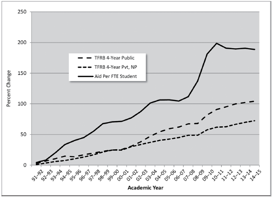 Percent Change in Aid per Full-Time-Equivalent Undergraduate Student and Published Tuition, Fees, and Room and Board Charges Since the 1990–91 Academic Year, Inflation Adjusted