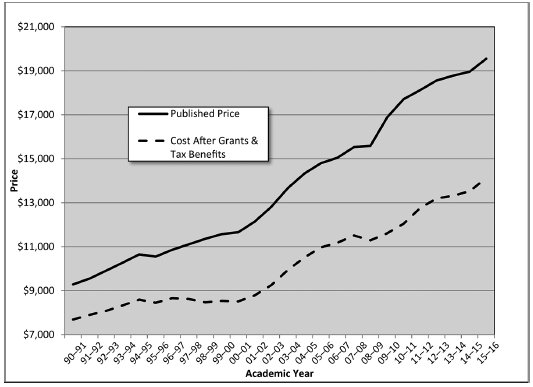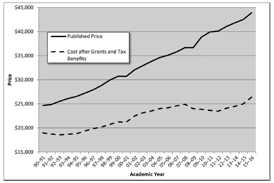 Published Tuition, Fees, and Room and Board Charges vs. Net Cost after Grants and Tax Benefits, Private Four-Year Institutions, in 2015 Dollars