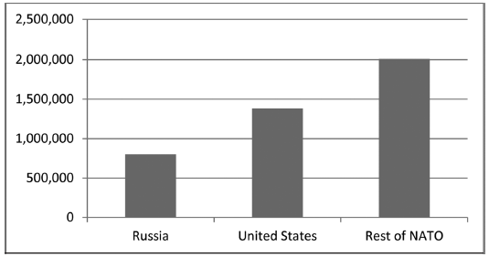Russia itself poses limited military threat to the United States — primarily through its nuclear arsenal — and even its ability to threaten America's North Atlantic Treaty Organization (NATO) allies is often exaggerated. By some metrics, Russian military spending appears extremely high (5.4 percent of gross domestic product in 2015), but that number is artificially inflated by Russia's poor economic performance. As Figure 72.1 shows, when real levels of military spending are compared, Russian spending is dwarfed by that of the United States and by the combined spending of the other NATO members. And while Russia's military modernization program has been relatively successful in recent years, reducing the role of conscription and improving readiness, the Russian military lags behind Western forces in technological sophistication. Similarly, the Russian military appears large when compared to small neighboring states like Lithuania or Estonia. Yet as Figure 72.2 illustrates, Russia's active duty military is actually smaller than either that of the United States or the other, combined, NATO allies.