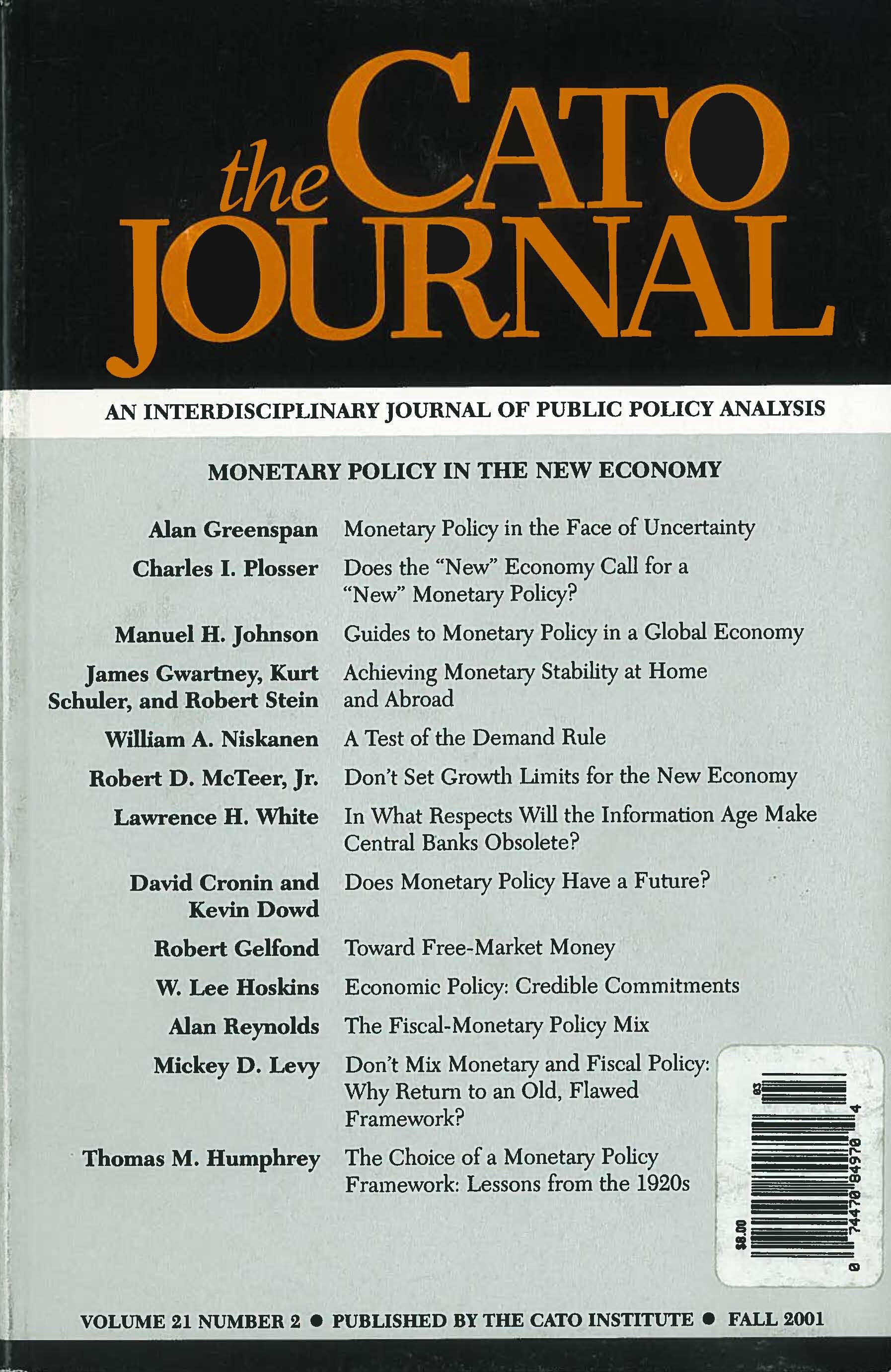 Fall 2001 Vol. 21 No. 2 Monetary Policy in the New Economy Share Articles Editor’s Note: Monetary Policy in the New Economy By James A. Dorn Monetary Policy in the Face of Uncertainty By Alan Greenspan Does the “New” Economy Call for a “New” Monetary Policy? By Charles I. Plosser Guides to Monetary Policy in a Global Economy By Manuel H. Johnson Achieving Monetary Stability at Home and Abroad By James D. Gwartney, Kurt Schuler, and Robert Stein A Test of the Demand Rule By William A. Niskanen Don’t Set Growth Limits for the New Economy By Robert D. McTeer, Jr. In What Respects Will the Information Age Make Central Banks Obsolete? By Lawrence H. White Does Monetary Policy Have a Future? By David Cronin and Kevin Dowd Toward Free-Market Money By Robert Gelfond Economic Policy: Credible Commitments By W. Lee Hoskins The Fiscal-Monetary Policy Mix By Alan Reynolds Don’t Mix Monetary and Fiscal Policy: Why Return to an Old, Flawed Framework? By Mickey D. Levy The Choice of a Monetary Policy Framework: Lessons from the 1920s By Thomas Humphrey You Call That Deregulation? A Critical Examination of Hugh Thomas’s Proposal to Deregulate Banking By George Selgin A Proposal to Deregulate Banking: Comment on Thomas By Biagio Bossone Book Review In Defense of Free Capital Markets by David DeRosa By William A. Niskanen America the Unusual by Jack Kingdon By Aaron Steelman Latest Issues Fall 2021 Spring/Summer 2021 Winter 2021 Fall 2020