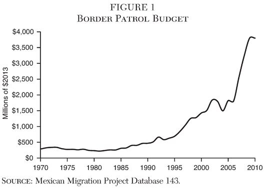 The dramatic increase in the intensity of border enforcement is indicated in Figure 1, which shows the size of the Border Patrol’s budget from 1970 through 2010 in constant 2013 dollars. In real terms, the budget remained flat from 1970 through 1986, when the Immigration Reform and Control Act (IRCA) funded a significant increase in the size of the Border Patrol. The curve rises slowly at first but accelerates after the passage of the 1996 Illegal Immigration Reform and Immigrant Responsibility Act and then rises exponentially with the passage of the USA PATRIOT Act in 2001 (a tortured backronym that stood for “Uniting and Strengthening America by Providing Appropriate Tools Required to Intercept and Obstruct Terrorism Act of 2001”). These accelerations in the enforcement effort occurred despite the fact that the actual inflow of migrants had stabilized around 1979.
