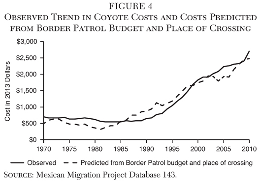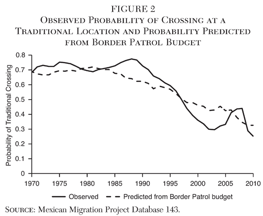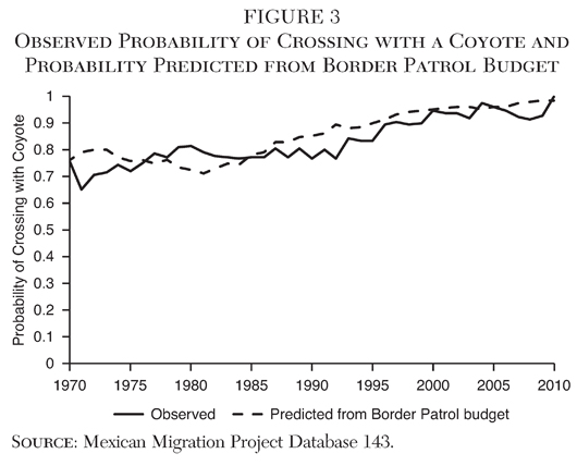 As before, the authors estimated an equation to examine the effect of the Border Patrol budget instrument on the likelihood of apprehension (1 if yes, 0 otherwise) in the presence of controls, and then they inserted the log of the budget instrument into the resulting equation, along with observed coyote costs, to generate the values plotted as a dashed line in Figure 5. Their equations indicated that rising enforcement did increase the probability of apprehension, but that this effect was offset by the rising quality of the services provided by coyotes (as proxied by their cost). In the end, the massive increase in border enforcement had a rather modest effect on likelihood of apprehension, increasing the predicted probability from 0.24 to 0.44 over a period of four decades.