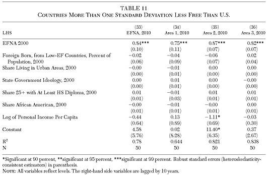 In Table 10, we attempt to further mitigate concerns about endogeneity by controlling for the prior trend in each state’s economic freedom. Here, our dependent variable is the change in a state’s EFNA score between 2000 and 2010, and we include as a control variable both its level of economic freedom in 2000 and the change in its economic freedom between 1980 and 2000. Only African immigrants have a significant relationship to the change in a state’s overall economic freedom between 2000 and 2010, and that relationship is strongly positive. Asian immigrants have a strongly positive relationship to the change in the subcomponent associated with government spending (Area 1); and both African and South American immigrants have a strongly positive relationship to the change in labor market freedom (Area 3). North American immigrants have a slight negative relationship to states’ labor market freedom scores, but the overall point estimate of this coefficient is very small.