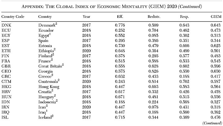 Two hundred forty-five years after the publication of Adam Smith’s An Inquiry into the Nature and Causes of the Wealth of Nations, economists continue to debate the causes of disparities in wealth among the countries of the world. Some scholars focus on the role of climate, natural resources, proximity to markets, or access to technology. Others study human capital, capital accumulation, the use of comparative advantages and economies of scale, and institutional and legal frameworks. We believe that another factor must be considered as well: the economic attitudes and causal beliefs (henceforth, “mentality”) of the population. While a growing body of research shows a clear association between economic growth and the institutions of economic freedom, those institutions can be quite fragile if the population does not have a clear understanding of what makes a country prosperous. To measure popular attitudes toward economic values, we have created the Global Index of Economic Mentality (GIEM).