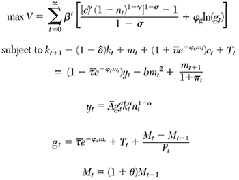 Equation (1) is the representative household’s lifetime utility function, which depends on consumption (c), leisure (1 − n, where n is labor supply given a unit time endowment), and the provision of public goods by the government (gt). Future utility is discounted to the present at the rate of time preference, ρ. The household chooses time paths for ct, nt, kt+1 (physical capital) and real money balances (mt = Mt /Pt, where M is the nominal stock of money, Pt is the price level, and πt = (Pt − Pt−1)/Pt−1 is the inflation rate) to maximize (1) with respect to the sequence of constraints in equation (2), presumed to hold for each period in the planning horizon. In equation (2), it is gross investment in physical capital, θ is the constant rate of price level inflation set by the government, yt is total output of the produced good (GDP), Tt are lump sum taxes, τ(mt) is the effective income tax rate where money can be used to shield taxable income, v(mt) is the proportion of consumption expenditures used up in transactions, and the last term is a quadratic storage cost function for currency. Equation (3) is the production function that I incorporate directly into the household’s constraint owing to the central planner assumption: α is the elasticity of output with respect to the capital stock, and a is the elasticity of output with respect to government spending.8 The final equation is the government’s budget constraint, which shows that government spending is financed by income taxes and money growth. All lowercase variables, except labor, are real (as opposed to unit of account) values and measured in terms of the consumer good. Labor is simply the number of hours worked.
