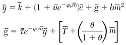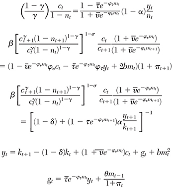 Together with the production function, these equations determine optimal paths for c, n, m, k′, g and y, taking initial values for k and m as given and lump sum taxes, T as exogenous. The model admits a steady state in which the endogenous variables are constant and the rate of inflation πt = θ. Because T is exogenous, changes in income taxes and seigniorage, which are endogenous, necessarily determine government spending. The model’s steady state is: